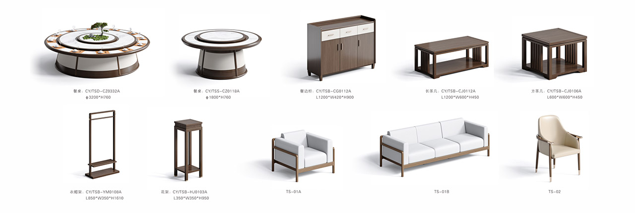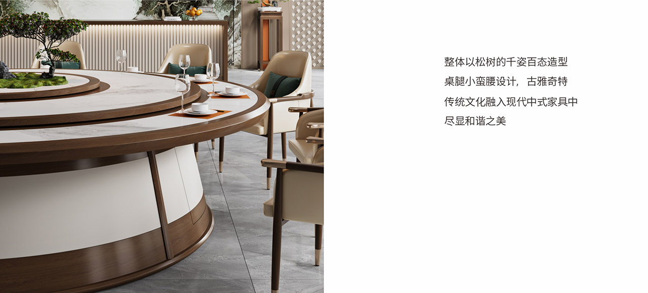 整体以松树的千姿百态造型,桌腿小蛮腰设计,古雅奇特。传统文化融入现代中式家具中,尽显精炼大气和谐之美。