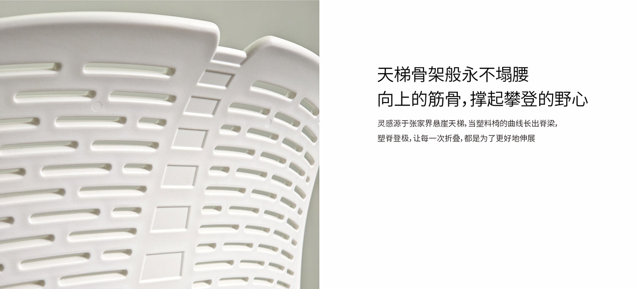 永恋背脊灵感源于张家界悬崖天梯,当塑料椅的曲线长出脊梁,塑脊登极,让每一次折叠,都是为了更好地伸展。