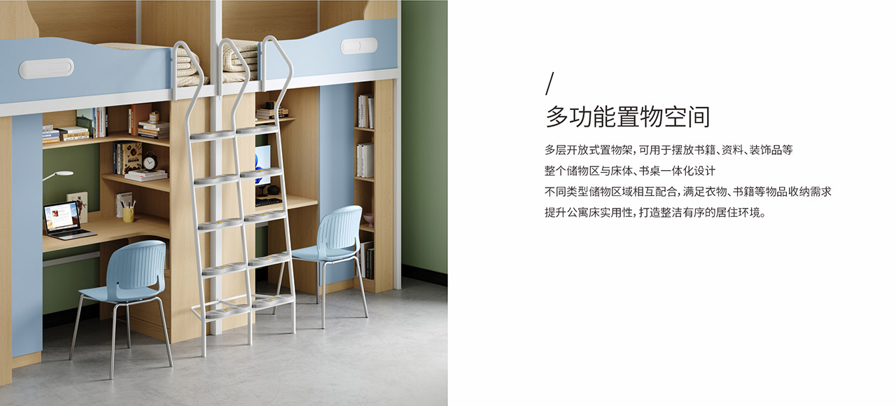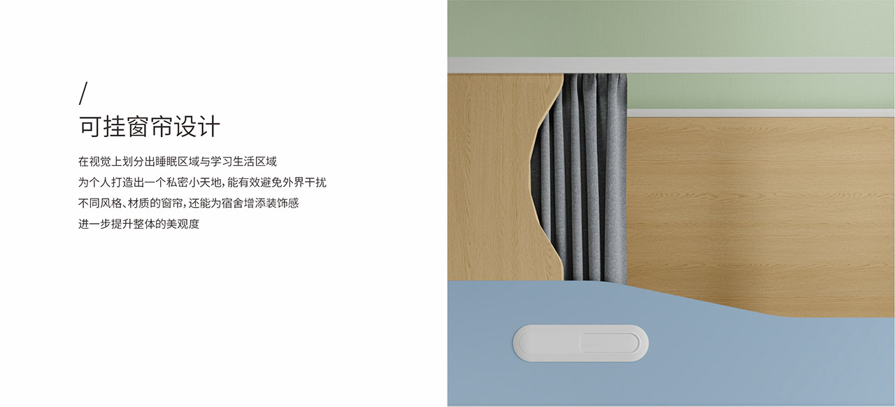 简约现代的设计风格,整体框架线条利落。床体颜色以浅木色为主,搭配部分白色边框和浅蓝色护栏,营造出清新自然又不失活泼的氛围。