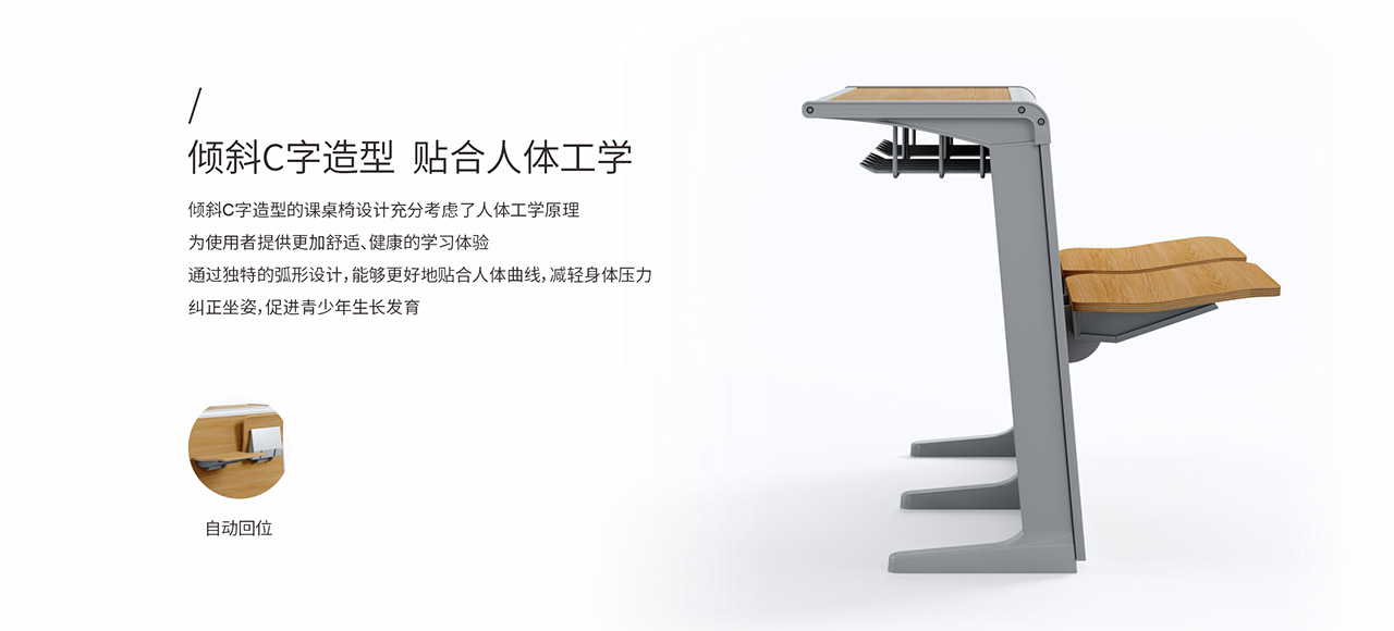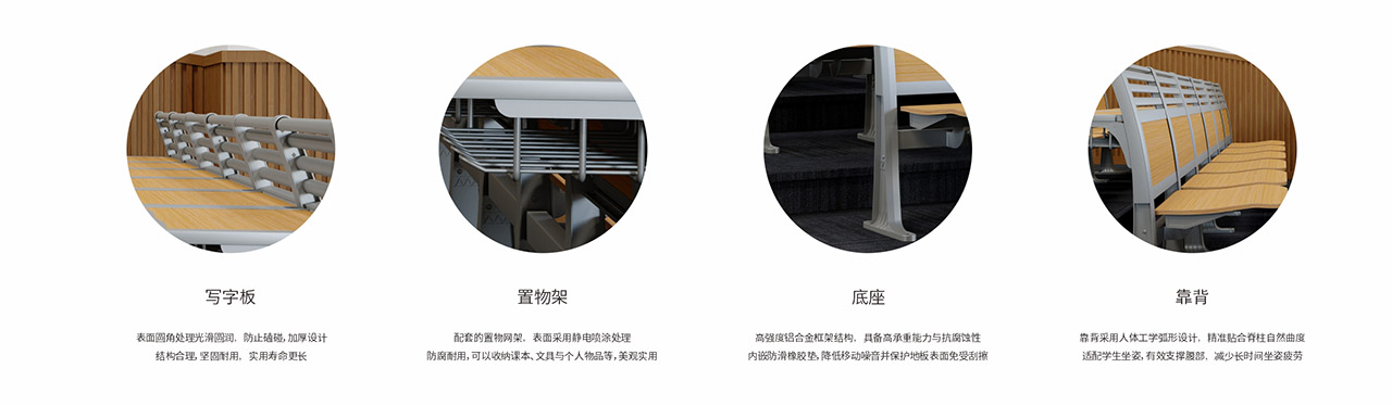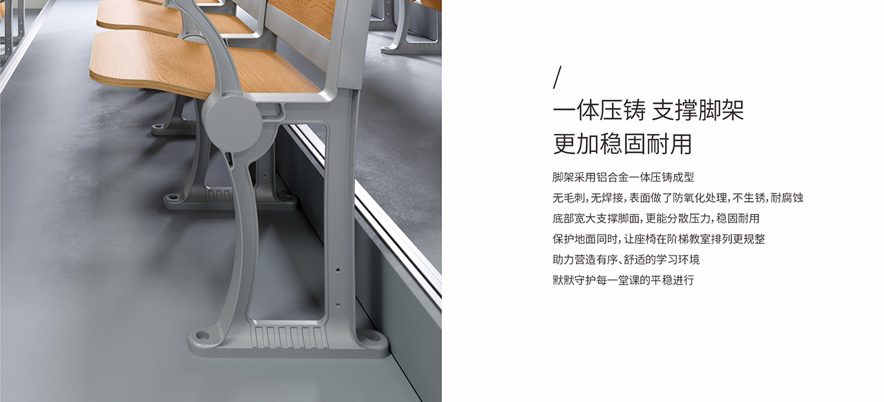 桌椅采用联排一体化设计,铝合金框架连接,结构稳固,相邻座椅间距精准控制,保证学生进出通道顺畅,又能最大化利用教室空间。