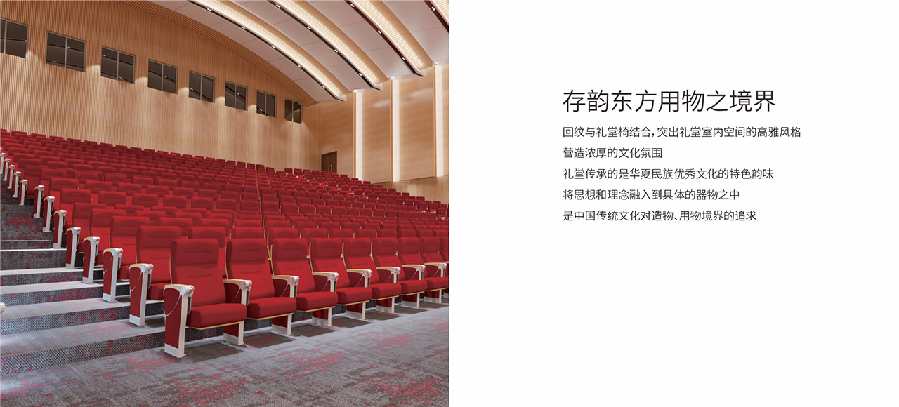 现代金属与古典纹样相结合,回纹富于理性的横竖转折,给中国传统纹样艺术史添上了精致庄重的一笔,充分地展示出了永承礼堂椅沉稳、大方的艺术特征。