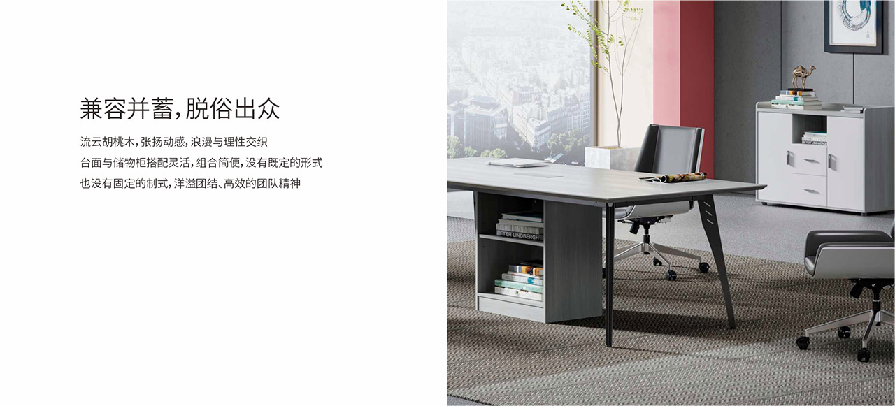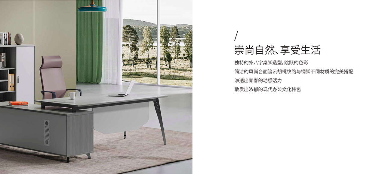 崇尚自然、享受生活、独特的外八字桌脚造型,跳跃的色彩,简洁的风尚台面流云胡桃纹路与钢脚不同材质的完美搭配,渗透出青春的动感活力,散发出浓郁的现代办公文化特色。